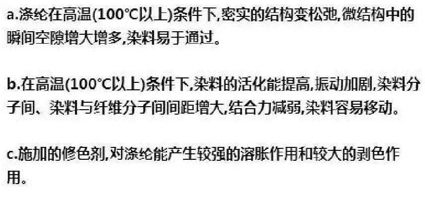 分散染料染涤纶,染料与涤纶之间是靠多种分子作用力(主要是氢键和范德华力)而结合。所以,染色涤纶减色,可采用一般物理方法,即高温移染法减色。